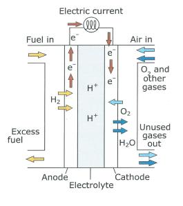 Scheme of a proton-conducting fuel cell by R. Dervisoglu. Courtesy of Wikipedia. There are many types of fuel cells, including direct-menthol and alkaline varieties, but polymer electrolyte membrane (PEM) fuel cells are the best for cars. In a PEM fuel cell, hydrogen and oxygen react to make water, electricity, and heat. Regenerative or reversible fuel cells are useful for energy storage. They can both make electricity and water out of hydrogen and oxygen and use electricity to separate water back into hydrogen and oxygen, which can later be reacted to produce more electricity (“Fuel Cell Basics”).